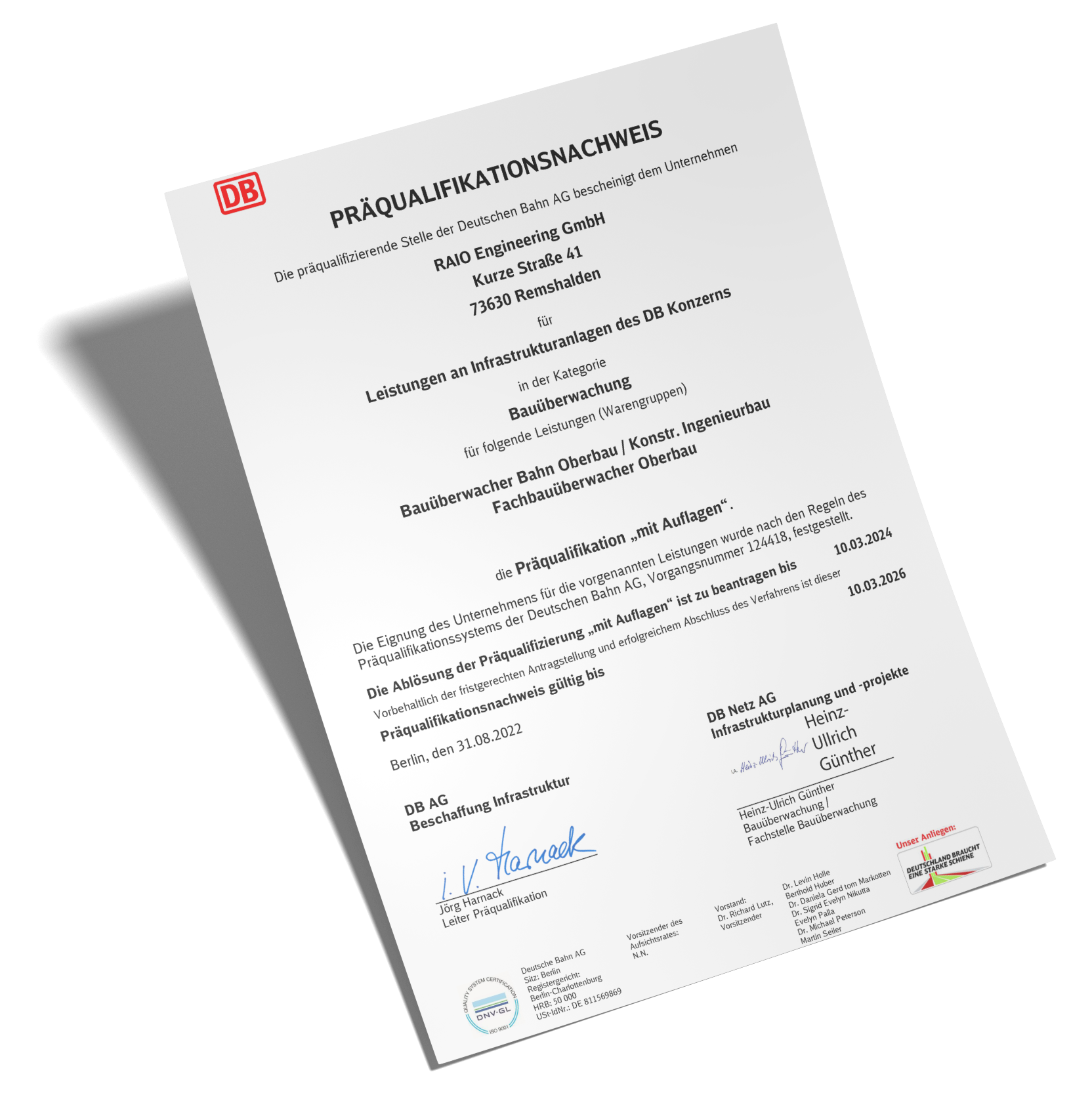 Unsere Qualität spricht für uns. Das sieht die DB AG genauso. Wir sind präqualifiziertes Unternehmen der DB und damit nachgewiesenermaßen zuverlässig und qualitätsbewusst. Profitieren auch Sie von unserer Expertise.